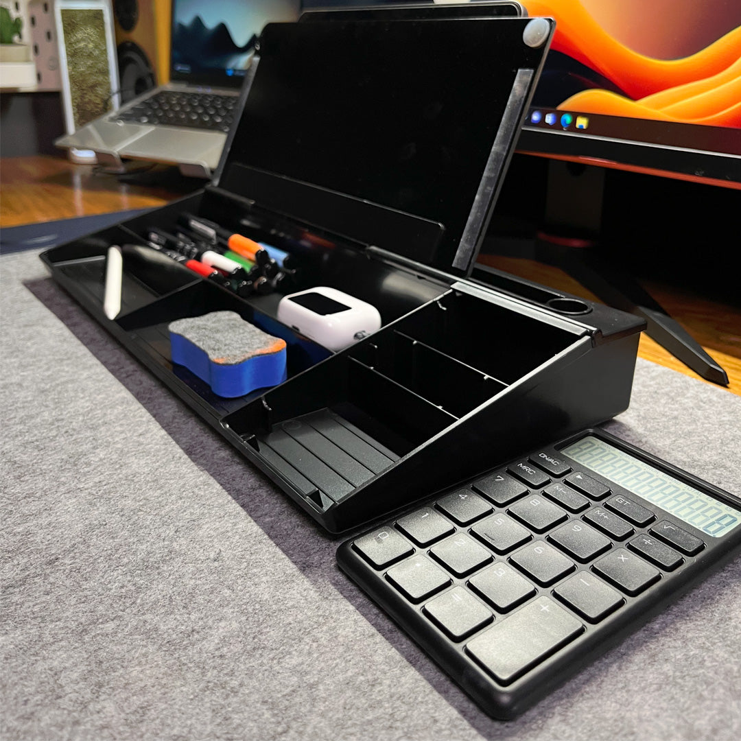 Organize your desk space by storing all of your pens, pencils, highlighters, rulers, paper clips, staples, and other desktop accessories in the DeskBoard Buddy's hidden accessory storage compartment.